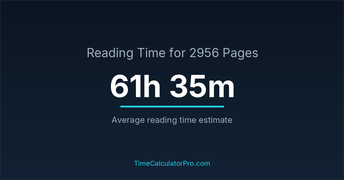 If you read at an average speed of 200 words per minute, reading 2956 pages will take approximately 61 hours and 35 minutes. This estimate assumes around 250 words per page, which is typical for most books.