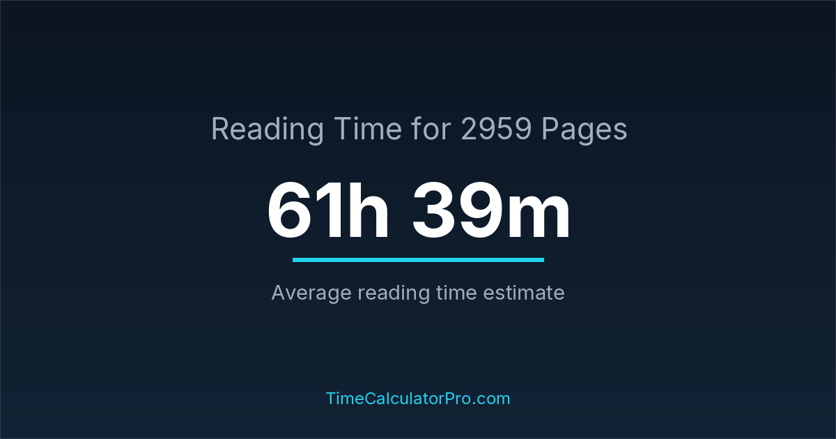 If you read at an average speed of 200 words per minute, reading 2959 pages will take approximately 61 hours and 39 minutes. This estimate assumes around 250 words per page, which is typical for most books.