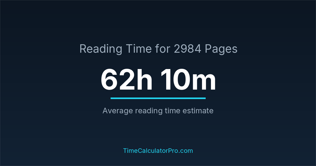 If you read at an average speed of 200 words per minute, reading 2984 pages will take approximately 62 hours and 10 minutes. This estimate assumes around 250 words per page, which is typical for most books.