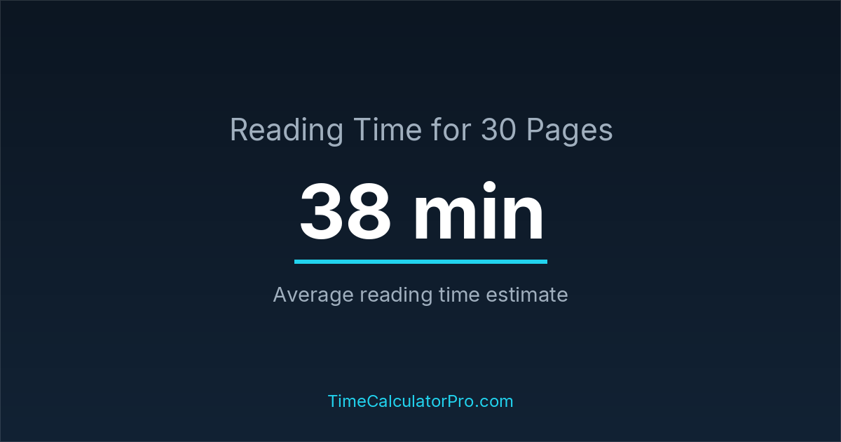 If you read at an average speed of 200 words per minute, reading 30 pages will take approximately 0 hours and 38 minutes. This estimate assumes around 250 words per page, which is typical for most books.