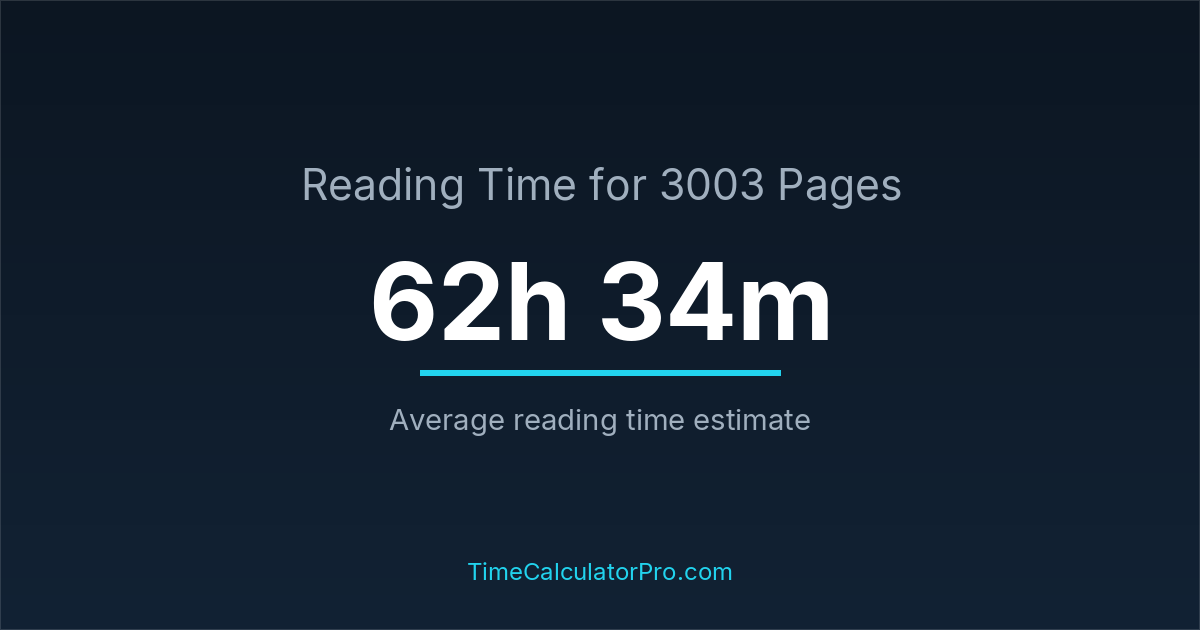 If you read at an average speed of 200 words per minute, reading 3003 pages will take approximately 62 hours and 34 minutes. This estimate assumes around 250 words per page, which is typical for most books.