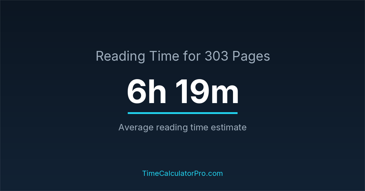 If you read at an average speed of 200 words per minute, reading 303 pages will take approximately 6 hours and 19 minutes. This estimate assumes around 250 words per page, which is typical for most books.