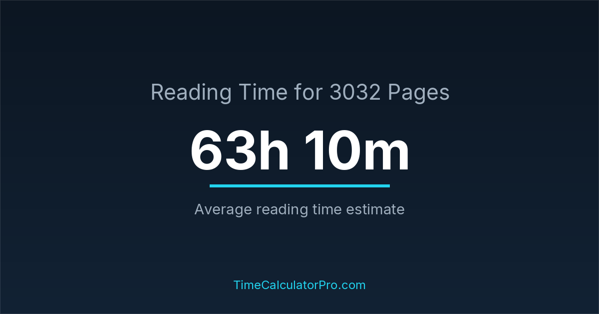 On average, reading 3032 pages may require about 63 hours and 10 minutes for most readers, assuming a standard reading pace and moderate difficulty.