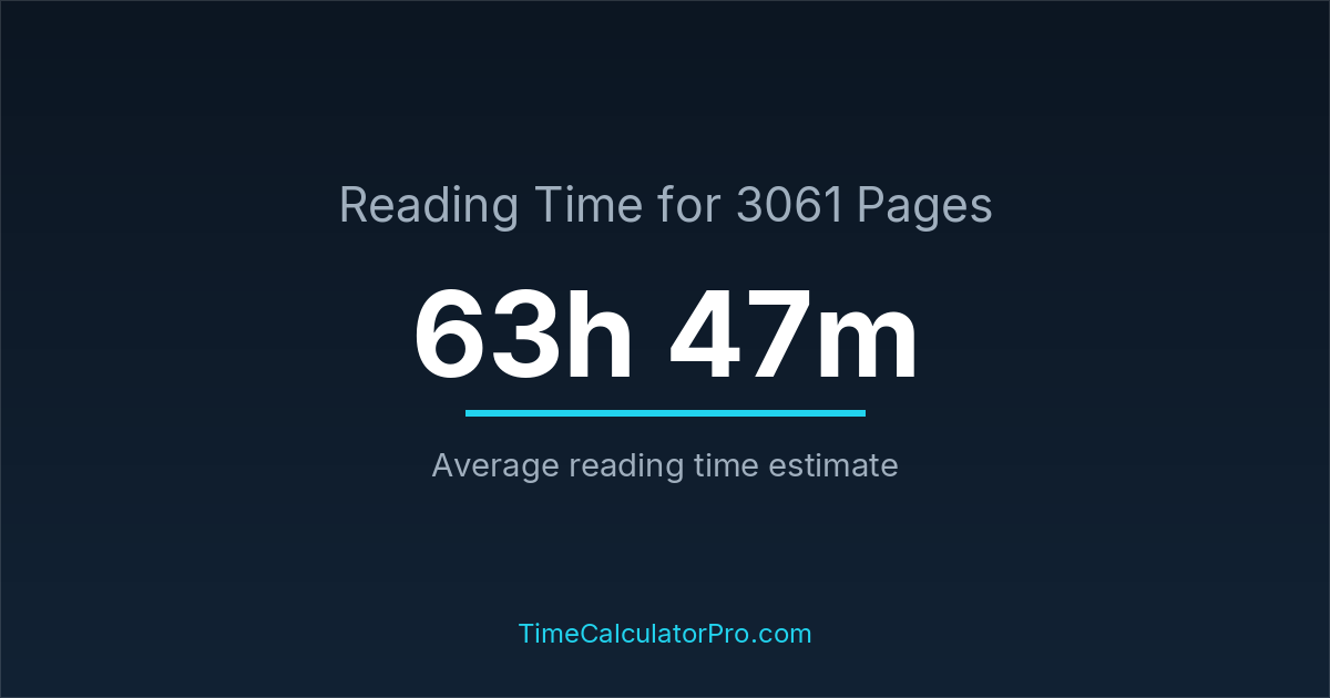 If you read at an average speed of 200 words per minute, reading 3061 pages will take approximately 63 hours and 47 minutes. This estimate assumes around 250 words per page, which is typical for most books.