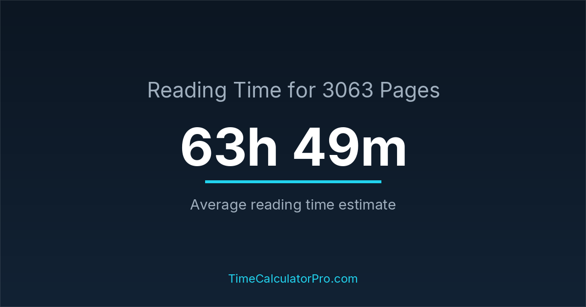 If you read at an average speed of 200 words per minute, reading 3063 pages will take approximately 63 hours and 49 minutes. This estimate assumes around 250 words per page, which is typical for most books.