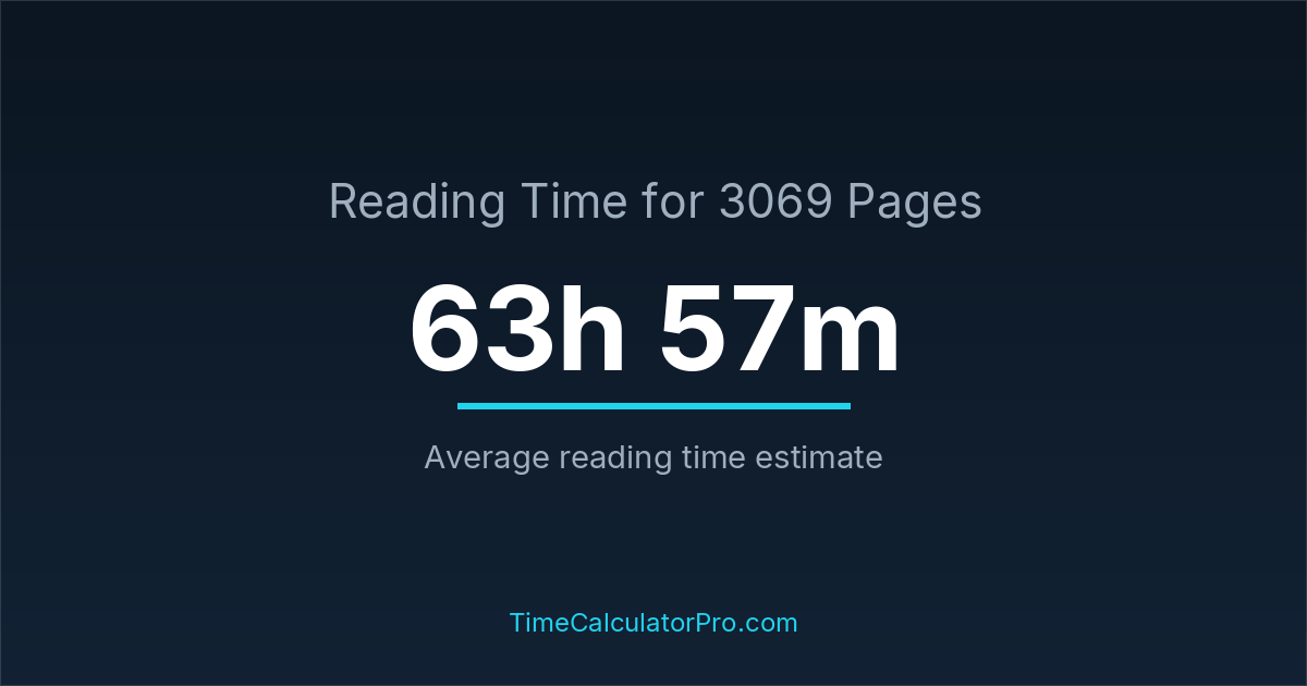 If you read at an average speed of 200 words per minute, reading 3069 pages will take approximately 63 hours and 57 minutes. This estimate assumes around 250 words per page, which is typical for most books.