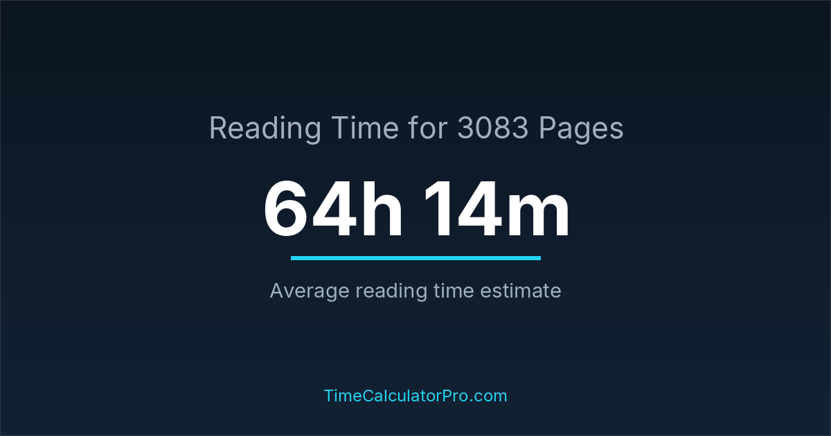 It typically takes around 64 hours and 14 minutes to read 3083 pages depending on your reading speed, focus level, and the complexity of the material.