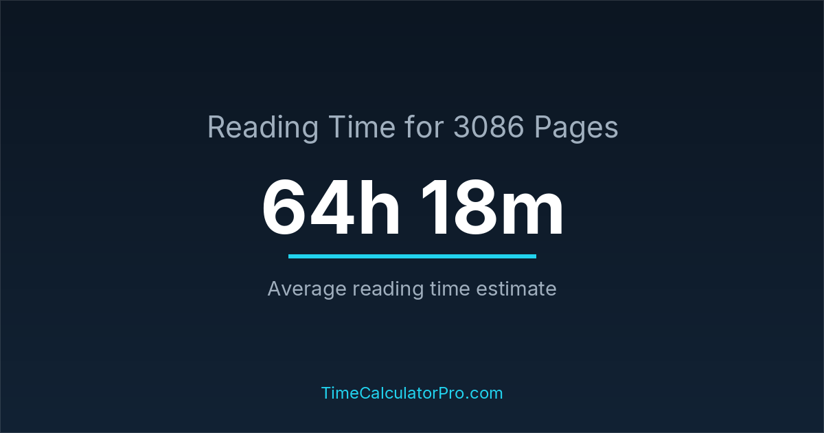 If you read at an average speed of 200 words per minute, reading 3086 pages will take approximately 64 hours and 18 minutes. This estimate assumes around 250 words per page, which is typical for most books.