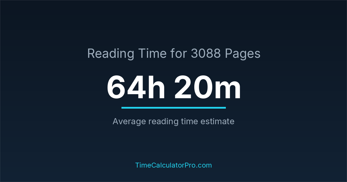 If you read at an average speed of 200 words per minute, reading 3088 pages will take approximately 64 hours and 20 minutes. This estimate assumes around 250 words per page, which is typical for most books.
