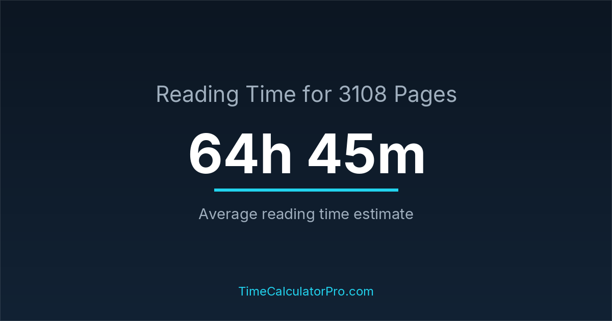 If you are wondering how long it takes to read 3108 pages, the estimated reading time is roughly 64 hours and 45 minutes based on common reading speed averages.