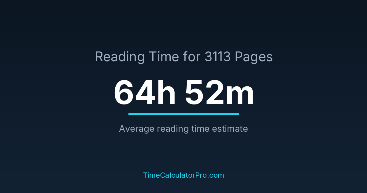 If you read at an average speed of 200 words per minute, reading 3113 pages will take approximately 64 hours and 52 minutes. This estimate assumes around 250 words per page, which is typical for most books.