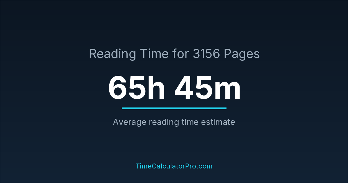 If you read at an average speed of 200 words per minute, reading 3156 pages will take approximately 65 hours and 45 minutes. This estimate assumes around 250 words per page, which is typical for most books.