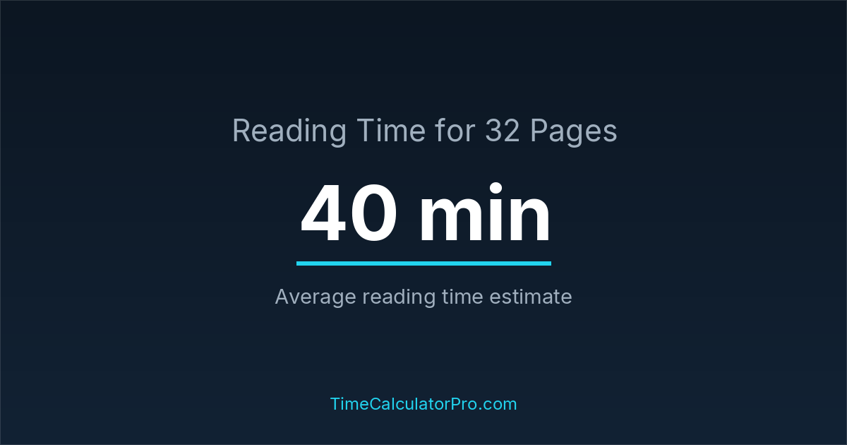 If you read at an average speed of 200 words per minute, reading 32 pages will take approximately 0 hours and 40 minutes. This estimate assumes around 250 words per page, which is typical for most books.