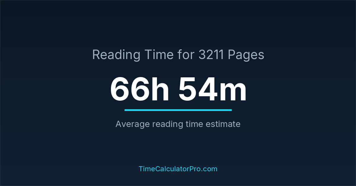 If you read at an average speed of 200 words per minute, reading 3211 pages will take approximately 66 hours and 54 minutes. This estimate assumes around 250 words per page, which is typical for most books.