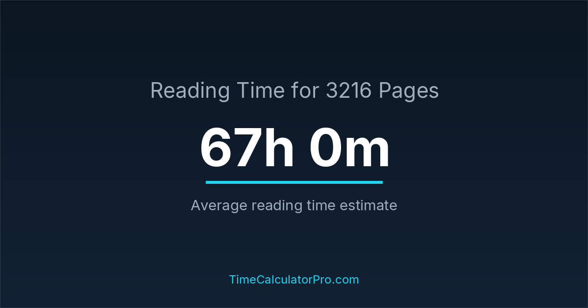 If you read at an average speed of 200 words per minute, reading 3216 pages will take approximately 67 hours and 0 minutes. This estimate assumes around 250 words per page, which is typical for most books.