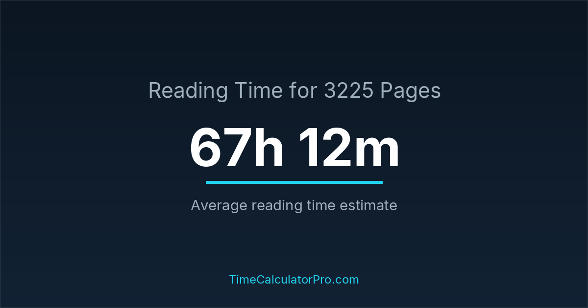 If you read at an average speed of 200 words per minute, reading 3225 pages will take approximately 67 hours and 12 minutes. This estimate assumes around 250 words per page, which is typical for most books.