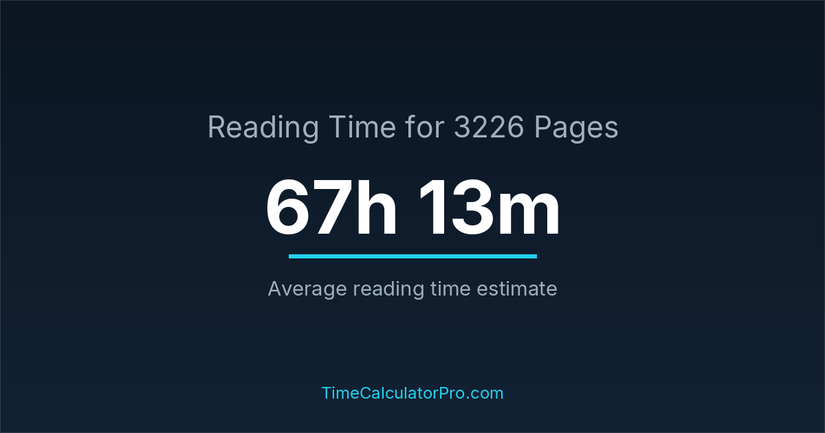 If you read at an average speed of 200 words per minute, reading 3226 pages will take approximately 67 hours and 13 minutes. This estimate assumes around 250 words per page, which is typical for most books.