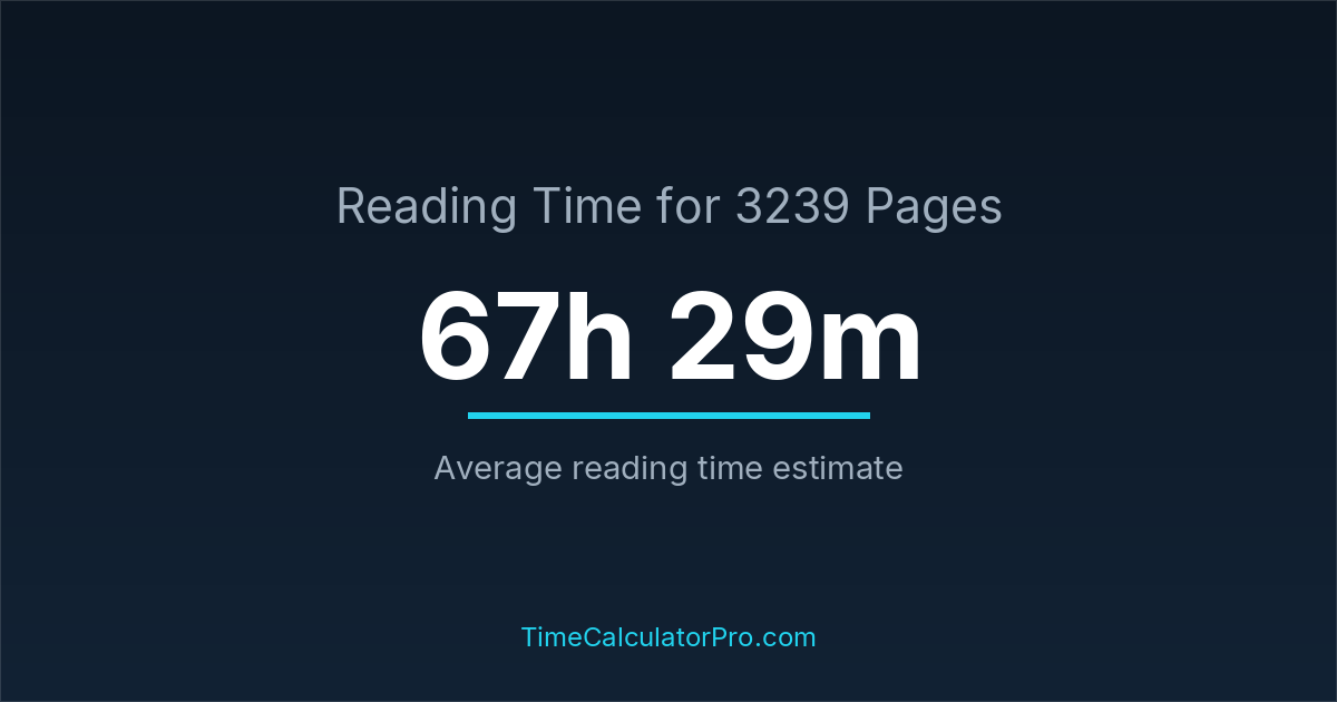 If you read at an average speed of 200 words per minute, reading 3239 pages will take approximately 67 hours and 29 minutes. This estimate assumes around 250 words per page, which is typical for most books.