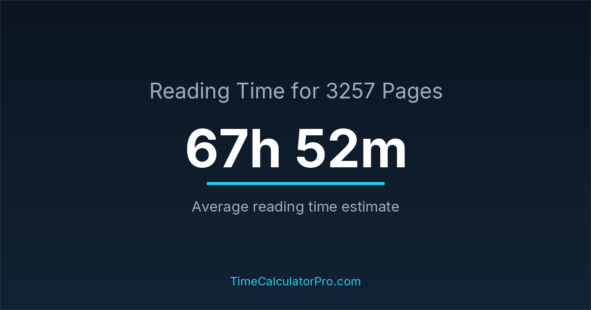 If you read at an average speed of 200 words per minute, reading 3257 pages will take approximately 67 hours and 52 minutes. This estimate assumes around 250 words per page, which is typical for most books.