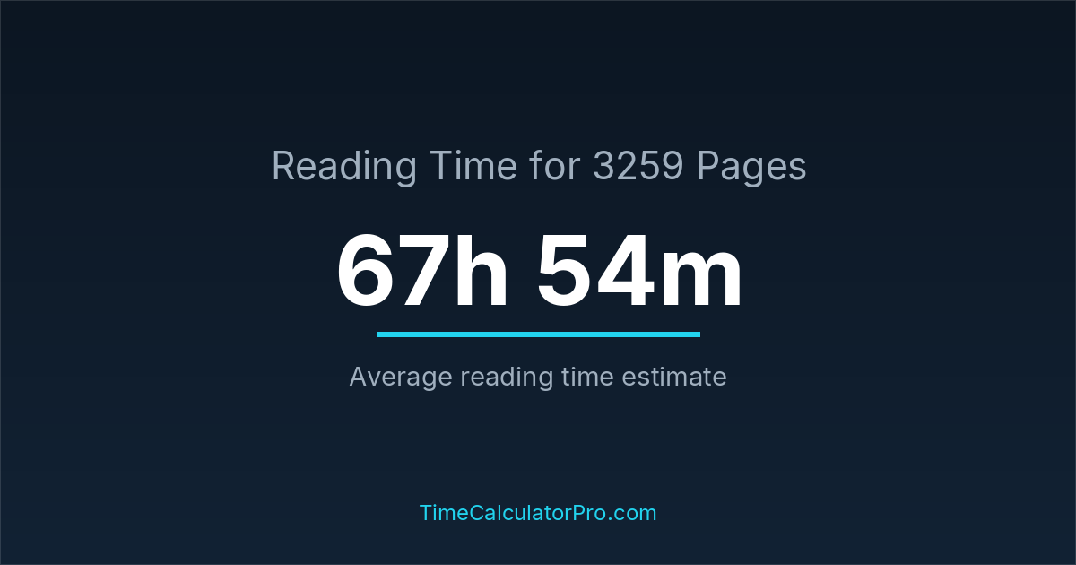 Reading 3259 pages usually takes approximately 67 hours and 54 minutes for the average reader, though this can vary depending on concentration and reading habits.