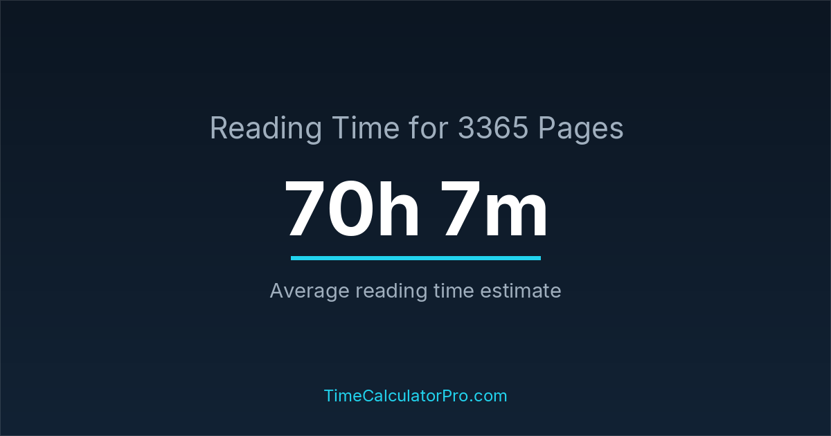 If you read at an average speed of 200 words per minute, reading 3365 pages will take approximately 70 hours and 7 minutes. This estimate assumes around 250 words per page, which is typical for most books.