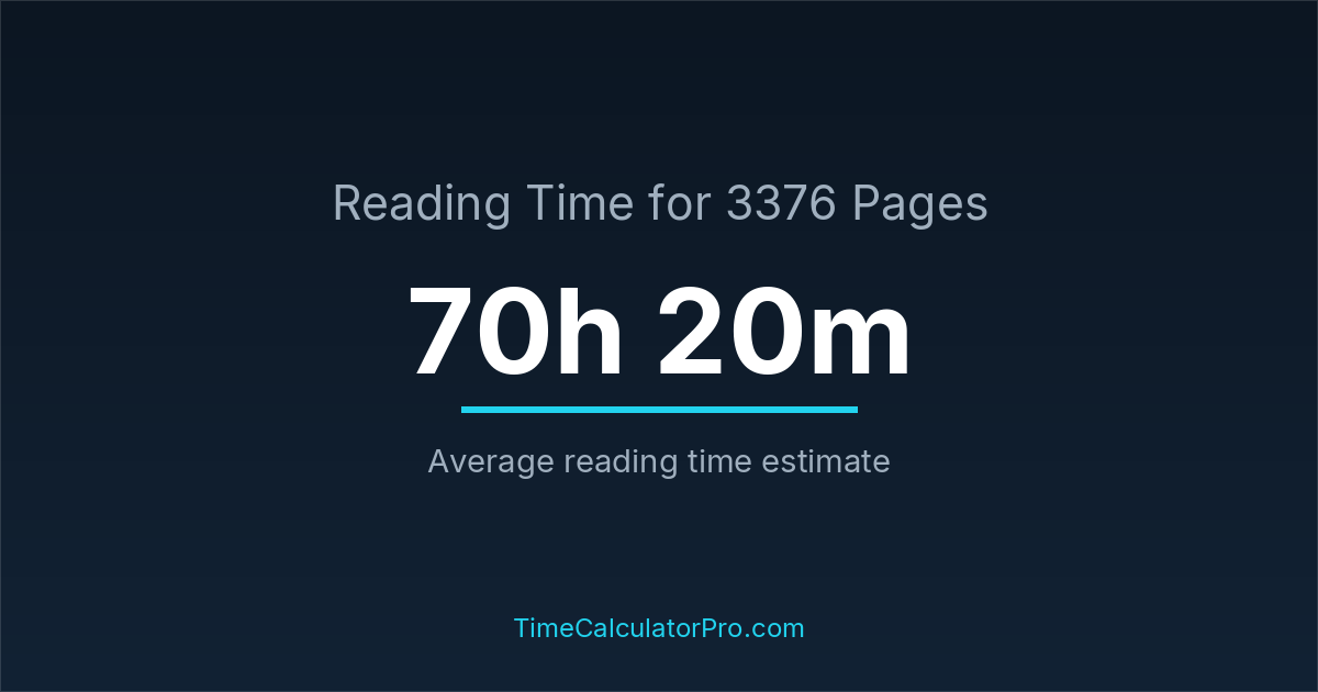 If you read at an average speed of 200 words per minute, reading 3376 pages will take approximately 70 hours and 20 minutes. This estimate assumes around 250 words per page, which is typical for most books.