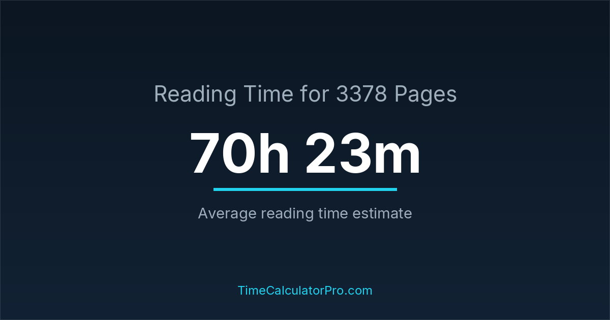 If you read at an average speed of 200 words per minute, reading 3378 pages will take approximately 70 hours and 23 minutes. This estimate assumes around 250 words per page, which is typical for most books.