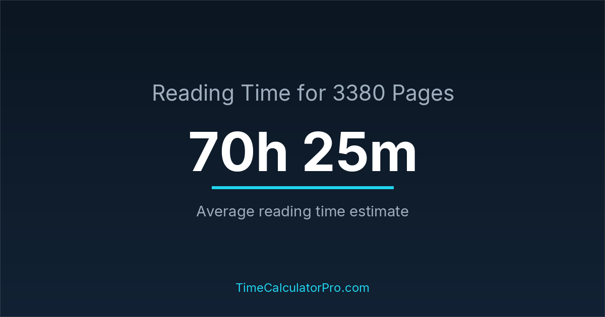 If you read at an average speed of 200 words per minute, reading 3380 pages will take approximately 70 hours and 25 minutes. This estimate assumes around 250 words per page, which is typical for most books.