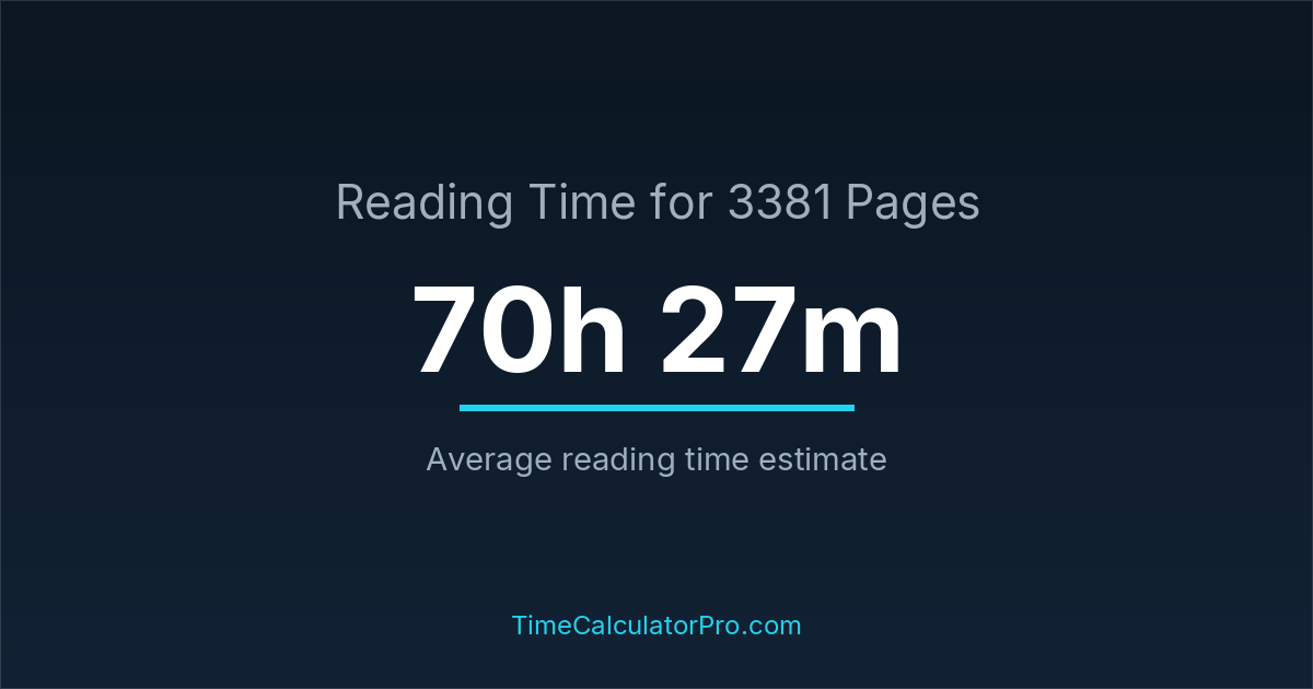 If you read at an average speed of 200 words per minute, reading 3381 pages will take approximately 70 hours and 27 minutes. This estimate assumes around 250 words per page, which is typical for most books.