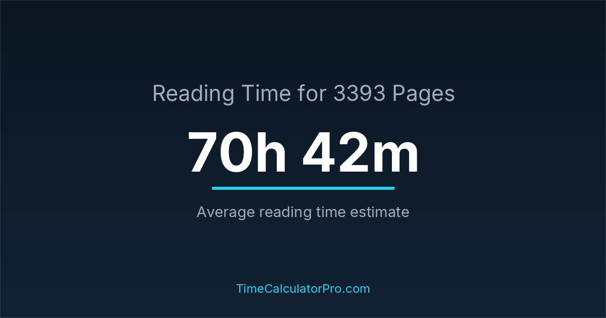 If you read at an average speed of 200 words per minute, reading 3393 pages will take approximately 70 hours and 42 minutes. This estimate assumes around 250 words per page, which is typical for most books.