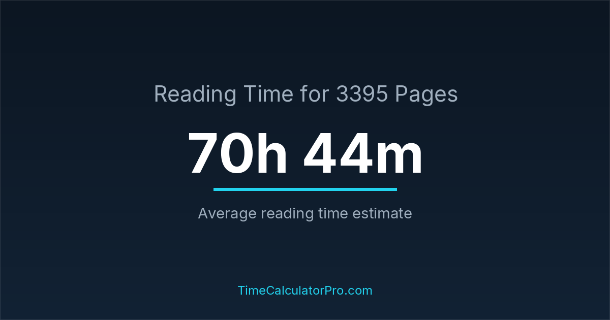 If you read at an average speed of 200 words per minute, reading 3395 pages will take approximately 70 hours and 44 minutes. This estimate assumes around 250 words per page, which is typical for most books.