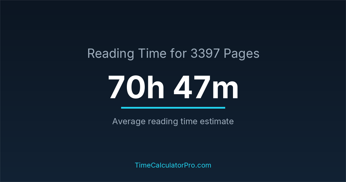 If you are wondering how long it takes to read 3397 pages, the estimated reading time is roughly 70 hours and 47 minutes based on common reading speed averages.