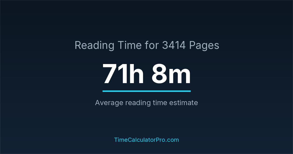 On average, reading 3414 pages may require about 71 hours and 8 minutes for most readers, assuming a standard reading pace and moderate difficulty.
