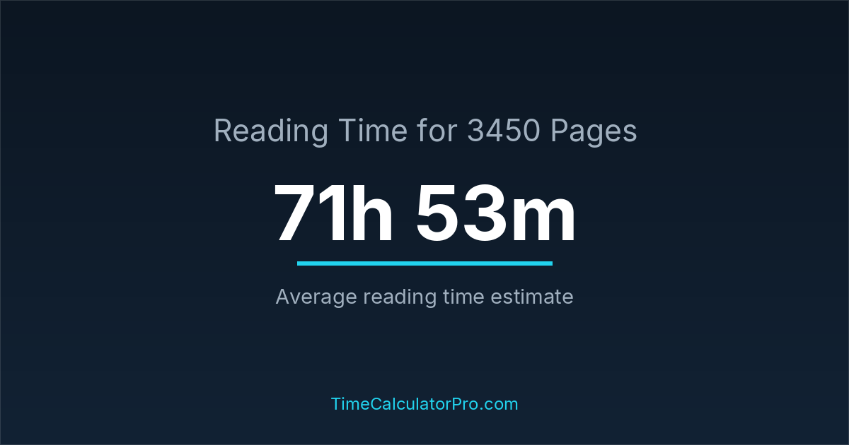 If you read at an average speed of 200 words per minute, reading 3450 pages will take approximately 71 hours and 53 minutes. This estimate assumes around 250 words per page, which is typical for most books.
