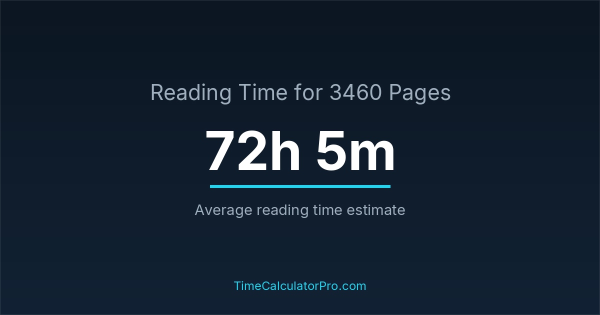 If you read at an average speed of 200 words per minute, reading 3460 pages will take approximately 72 hours and 5 minutes. This estimate assumes around 250 words per page, which is typical for most books.