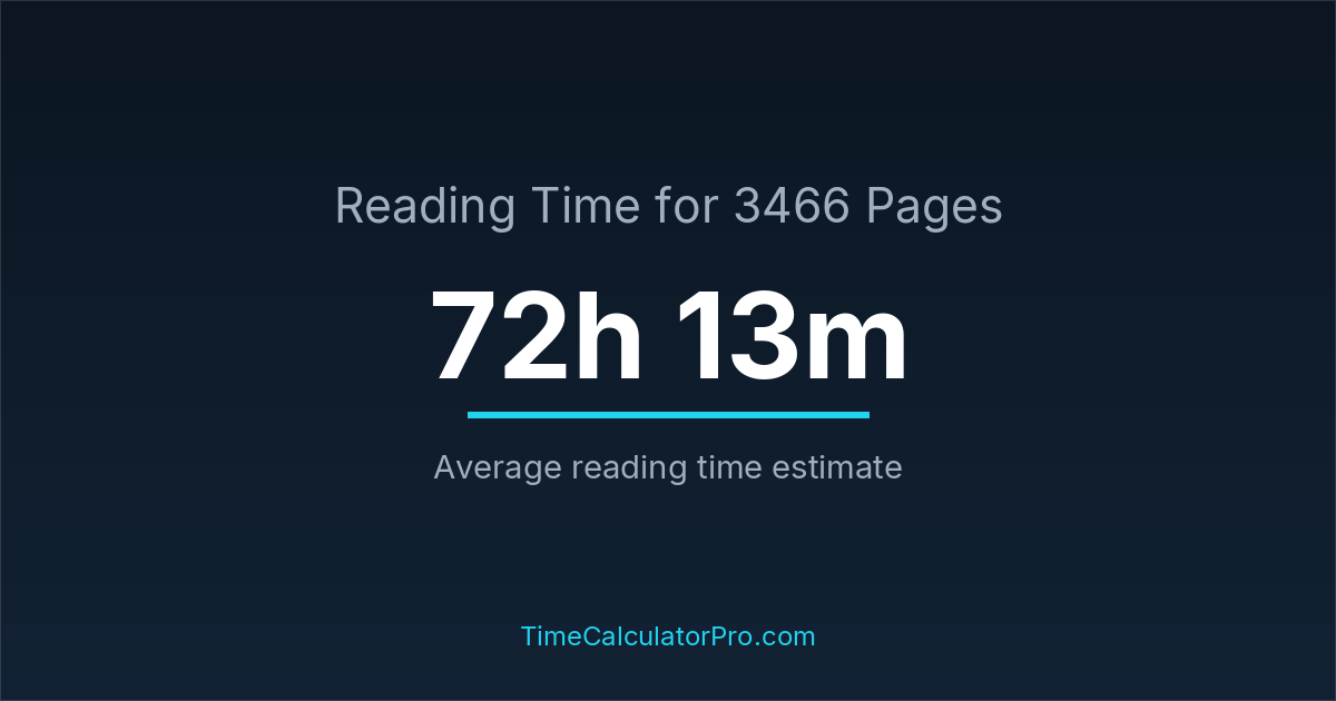 If you are wondering how long it takes to read 3466 pages, the estimated reading time is roughly 72 hours and 13 minutes based on common reading speed averages.