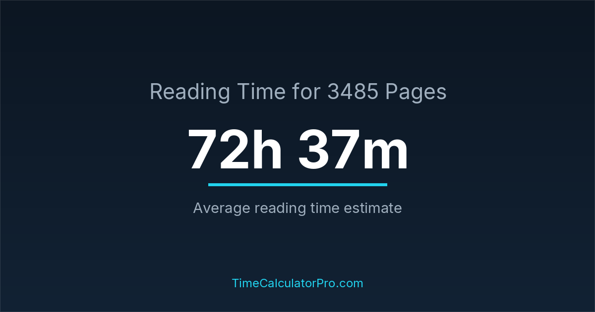If you read at an average speed of 200 words per minute, reading 3485 pages will take approximately 72 hours and 37 minutes. This estimate assumes around 250 words per page, which is typical for most books.