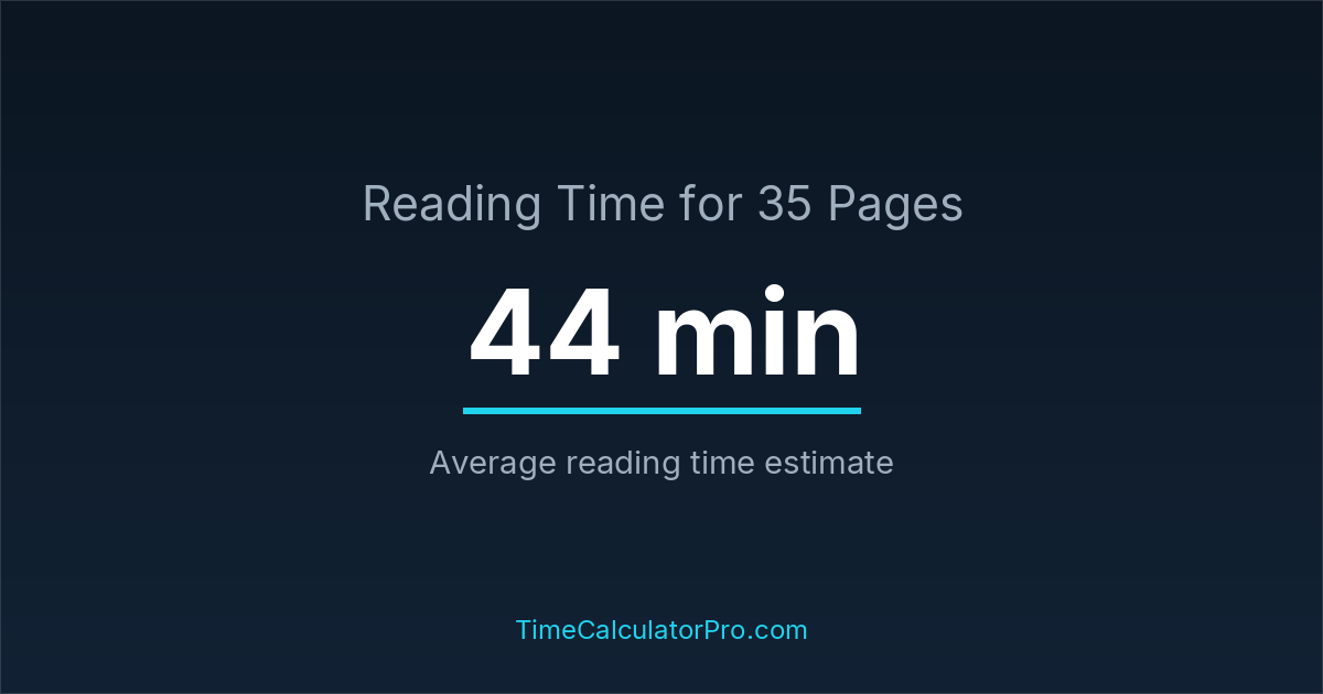 If you read at an average speed of 200 words per minute, reading 35 pages will take approximately 0 hours and 44 minutes. This estimate assumes around 250 words per page, which is typical for most books.