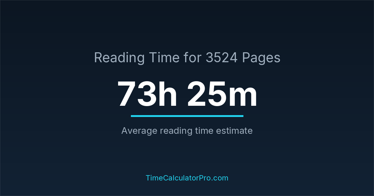 If you read at an average speed of 200 words per minute, reading 3524 pages will take approximately 73 hours and 25 minutes. This estimate assumes around 250 words per page, which is typical for most books.