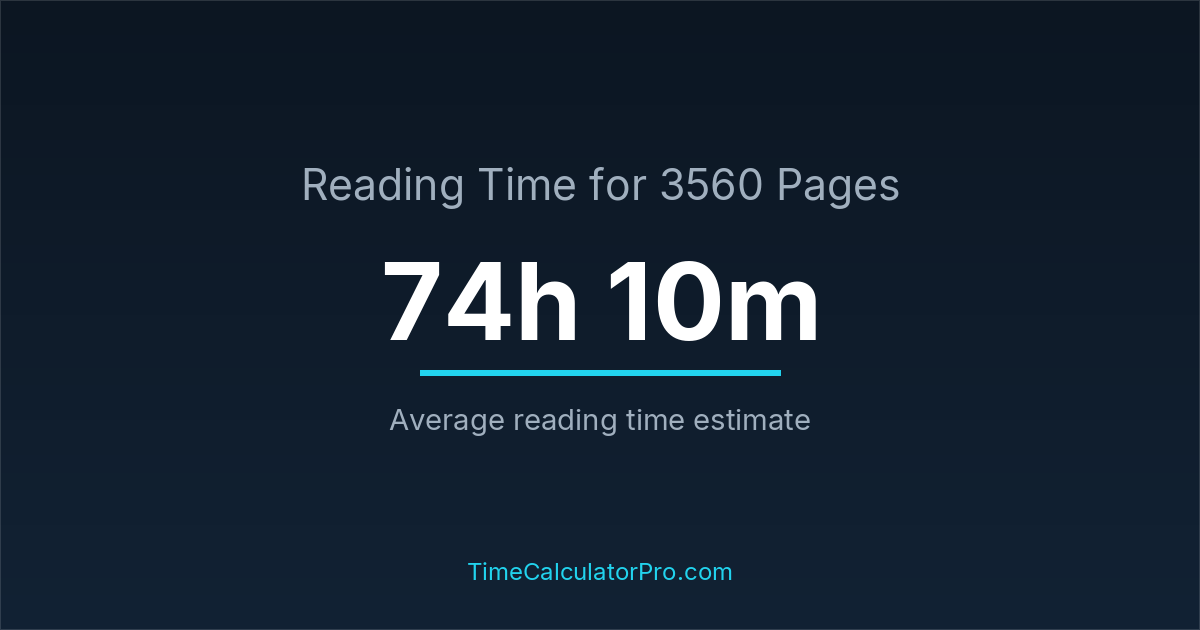 If you read at an average speed of 200 words per minute, reading 3560 pages will take approximately 74 hours and 10 minutes. This estimate assumes around 250 words per page, which is typical for most books.