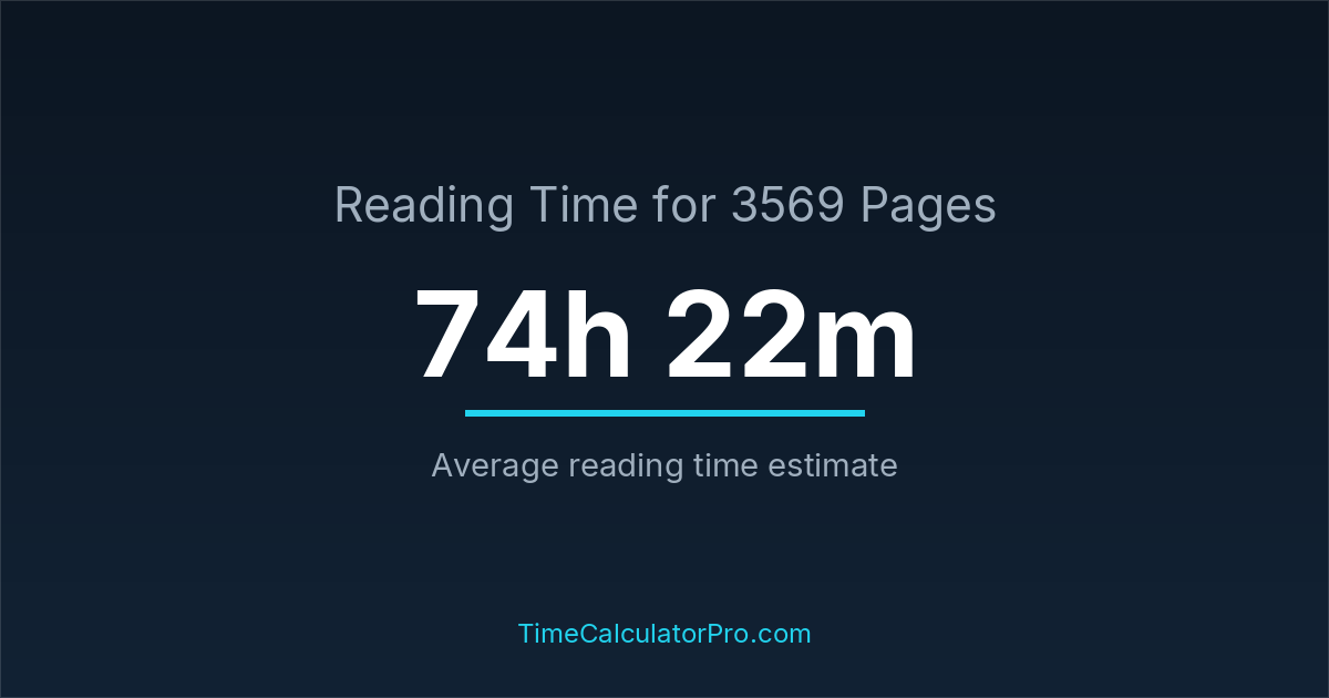 On average, reading 3569 pages may require about 74 hours and 22 minutes for most readers, assuming a standard reading pace and moderate difficulty.