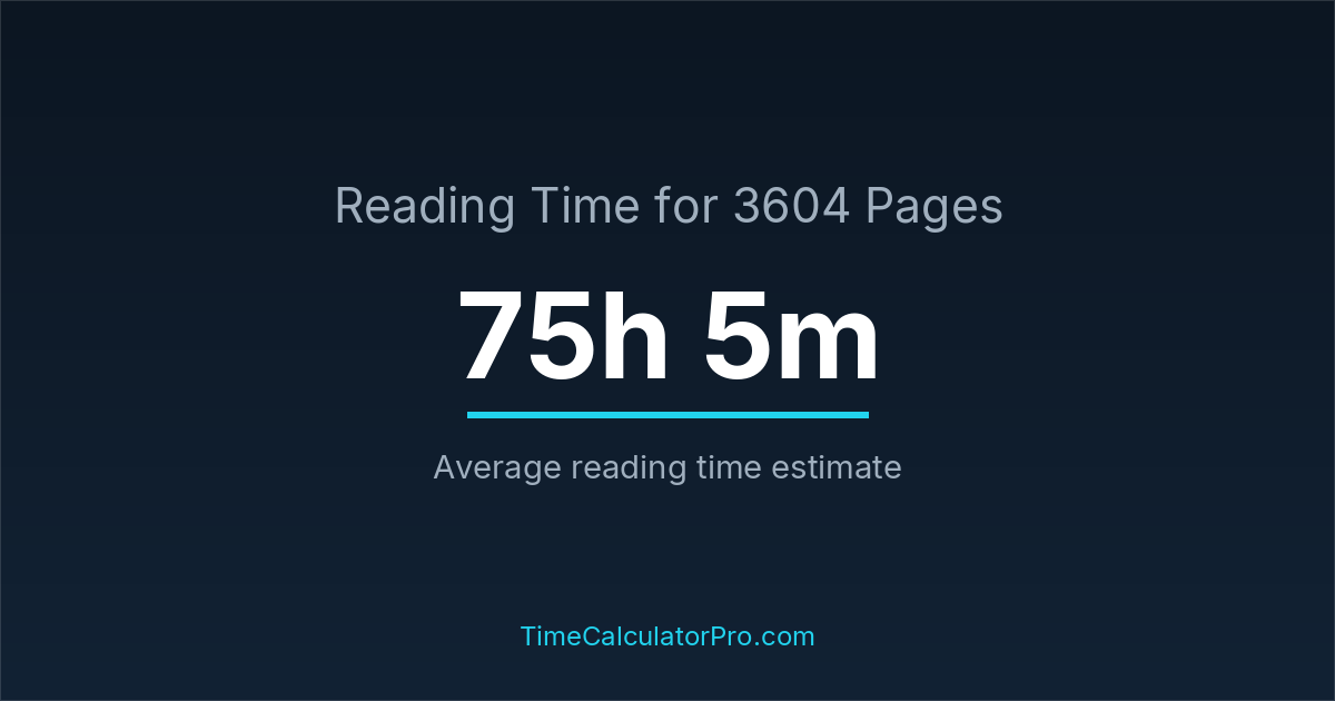 If you read at an average speed of 200 words per minute, reading 3604 pages will take approximately 75 hours and 5 minutes. This estimate assumes around 250 words per page, which is typical for most books.