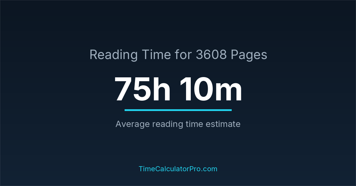 If you read at an average speed of 200 words per minute, reading 3608 pages will take approximately 75 hours and 10 minutes. This estimate assumes around 250 words per page, which is typical for most books.