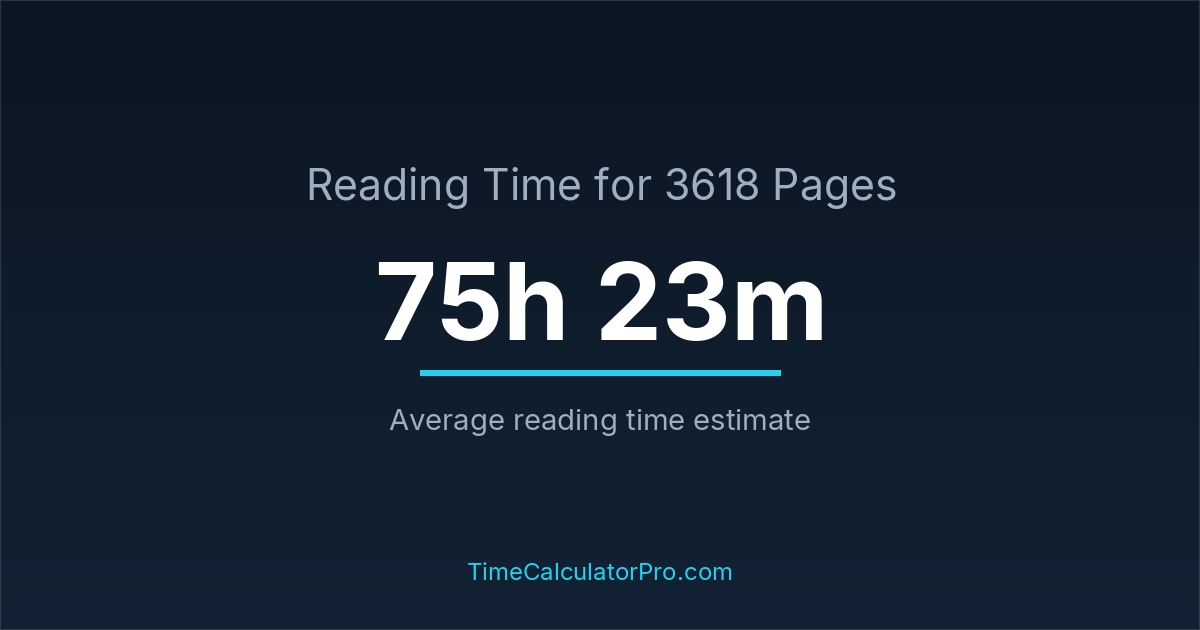 If you read at an average speed of 200 words per minute, reading 3618 pages will take approximately 75 hours and 23 minutes. This estimate assumes around 250 words per page, which is typical for most books.