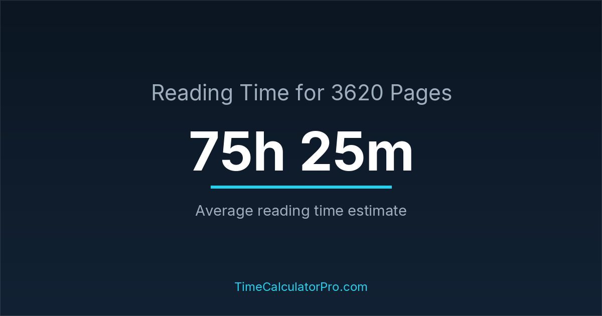 If you read at an average speed of 200 words per minute, reading 3620 pages will take approximately 75 hours and 25 minutes. This estimate assumes around 250 words per page, which is typical for most books.