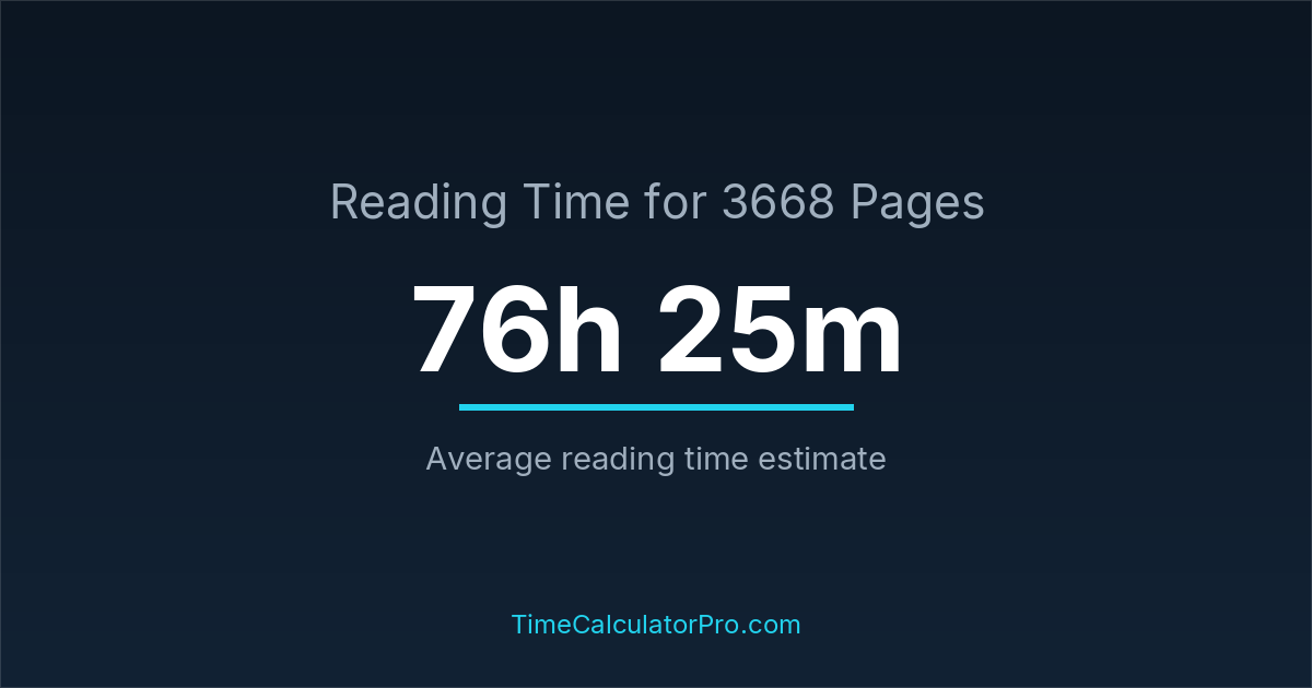 If you read at an average speed of 200 words per minute, reading 3668 pages will take approximately 76 hours and 25 minutes. This estimate assumes around 250 words per page, which is typical for most books.