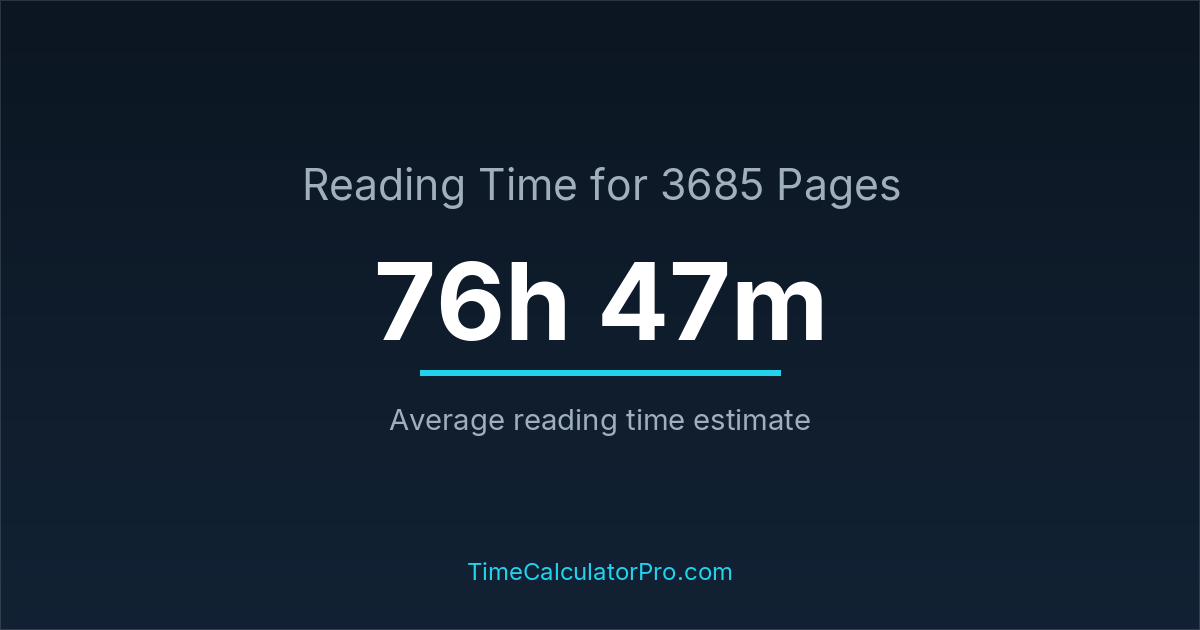 If you read at an average speed of 200 words per minute, reading 3685 pages will take approximately 76 hours and 47 minutes. This estimate assumes around 250 words per page, which is typical for most books.