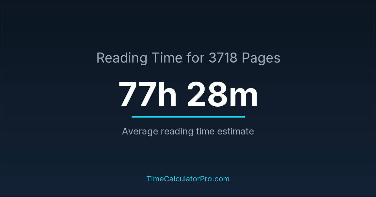 If you read at an average speed of 200 words per minute, reading 3718 pages will take approximately 77 hours and 28 minutes. This estimate assumes around 250 words per page, which is typical for most books.
