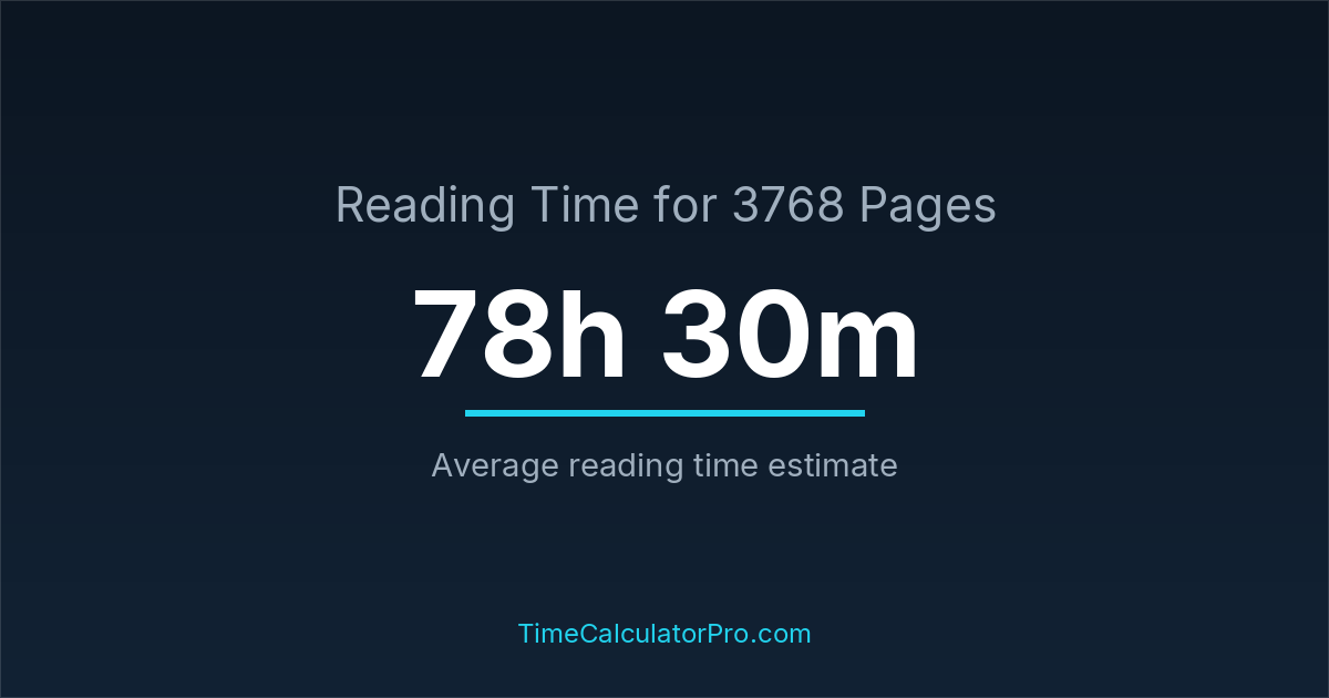 If you read at an average speed of 200 words per minute, reading 3768 pages will take approximately 78 hours and 30 minutes. This estimate assumes around 250 words per page, which is typical for most books.