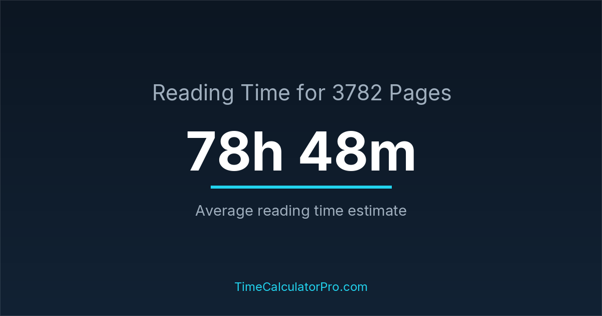 If you read at an average speed of 200 words per minute, reading 3782 pages will take approximately 78 hours and 48 minutes. This estimate assumes around 250 words per page, which is typical for most books.